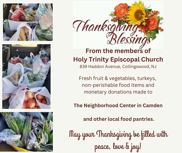 This week at Holy Trinity: Today, 5:30 p.m., Evening Prayer and Conversation on the Conference Line; Sunday, 9 a.m., Mass for the First Sunday of Advent; coffee hour to follow; 6 p.m., Liberti Kids; Monday, 7 p.m., AA; Wednesday, 7 p.m., Boy Scouts; Saturday, Dec. 6, Outdoor Decorating (sign-up sheet back of church); 10 a.m., Collingswood Theater Group; Saturday, 5:30 p.m., Evening Prayer and Conversation on the Conference Line.