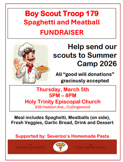 Thursday, March 5, 5 p.m., Boy Scout Troop 179 Spaghetti and Meatball Fundraiser.