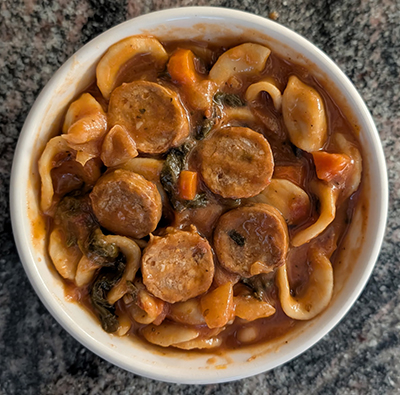 It's Italian Sausage Soup, not seen since 2020. The soup is available at coffee hour today. The soup is $4 a pint and $7 a quart. Each month, you can now order and pay on Vanco (there is a processing fee when you order online) or by cash or check as always, using the order form that appears here with a QR code for online ordering.