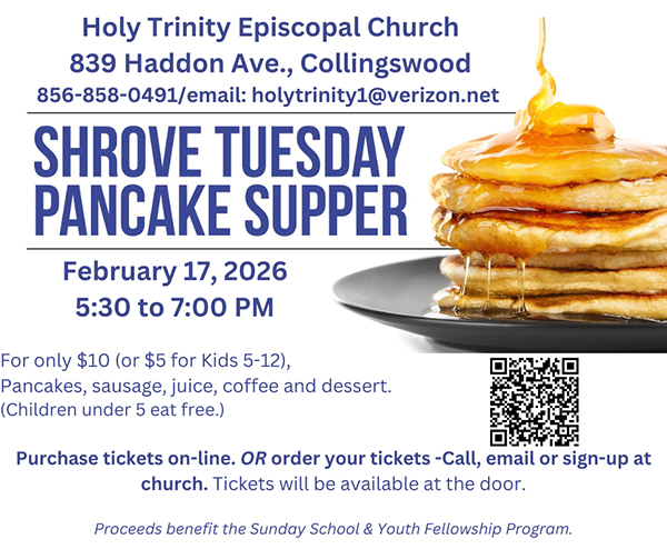 This week at Holy Trinity: Monday, 7 p.m., AA (every week); Tuesday, 7:30 p.m., Vestry; Wednesday, 7 p.m., Boy Scouts (every week); Thursday, 6 p.m., Coin Collectors; Saturday, 10 a.m., Collingswood Theater Company rehearsal; 5:30 p.m., Evening Prayer and Conversation on the Conference Line (every week).